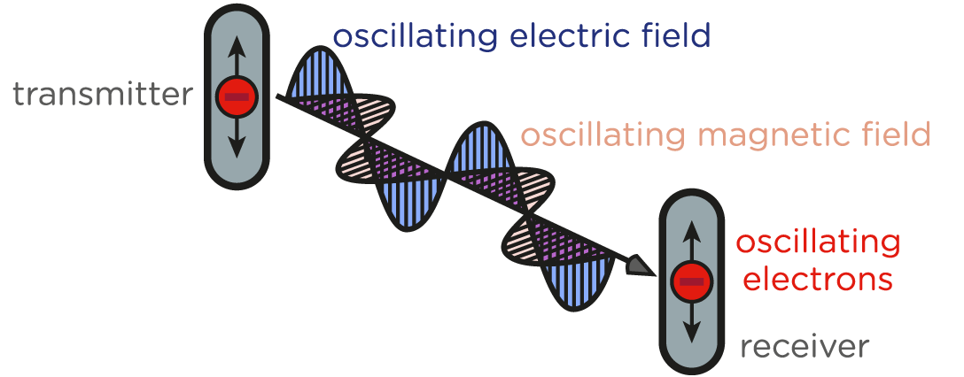 • Radio waves can be sent and received using aerials. An alternating current of high frequency in the transmitter causes electrons to oscillate up and down the aerial.