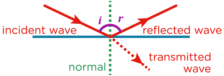 • Waves will be reflected such that \(\text{angle of incidence}=\text{angle of reflection}\).