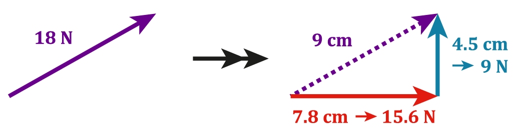 • Draw the original force as a vector arrow in the correct direction and to a suitable scale.